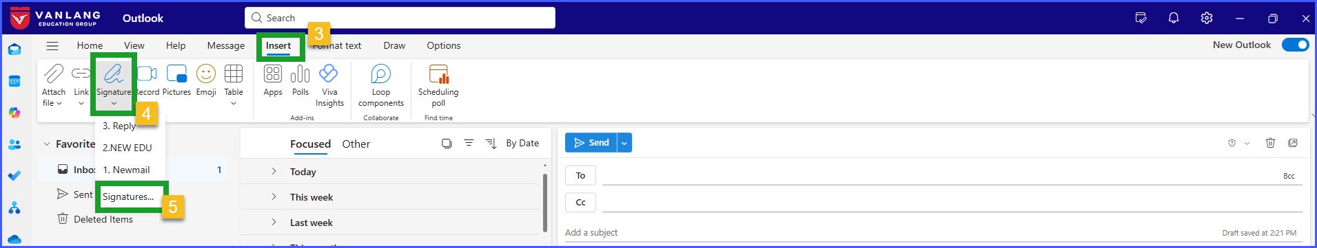 - Bước 3,4,5 : Chọn Menu Message, sau đó tiếp tục nhấn chọn Signature để xuất hiện hộp thoại Signature and Stationery.