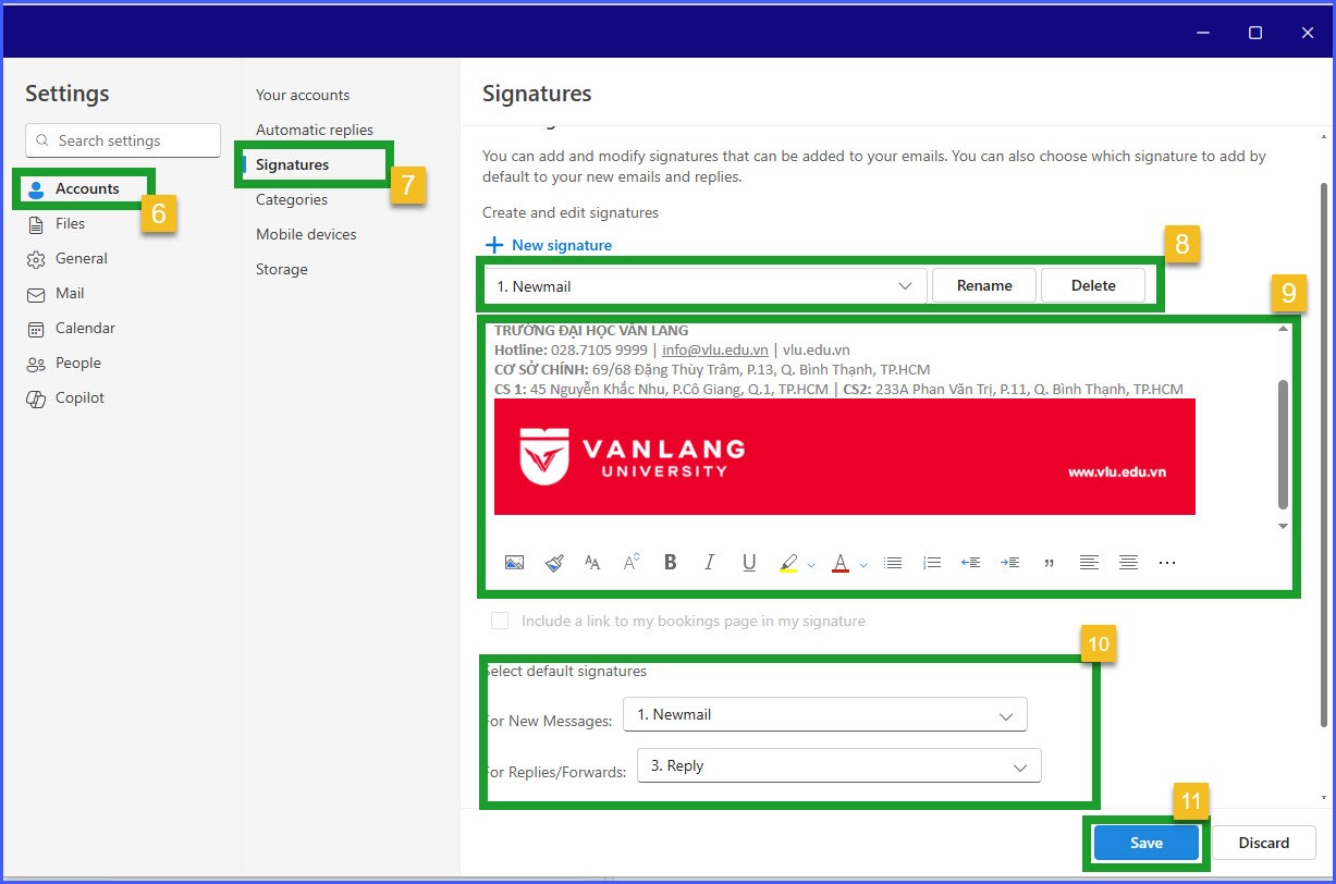 - Bước 6,7: Click chọn Accounts --> Signature chọn New signature nếu chưa có, đặt tên cho phần chữ ký, rồi chọn OK.